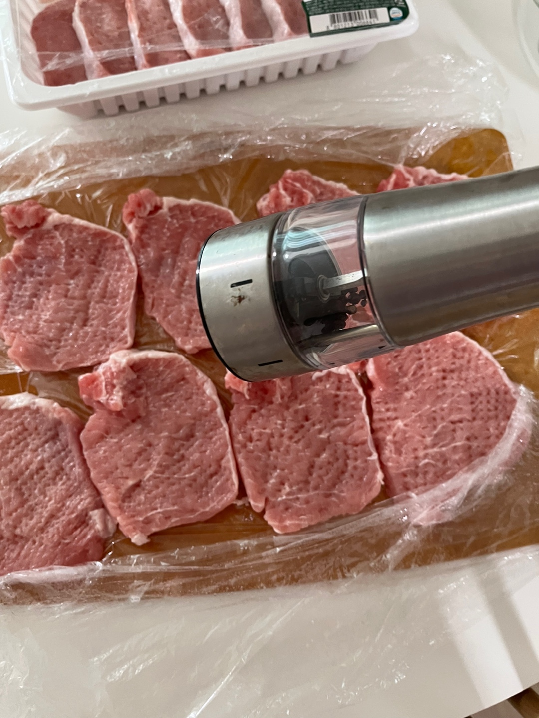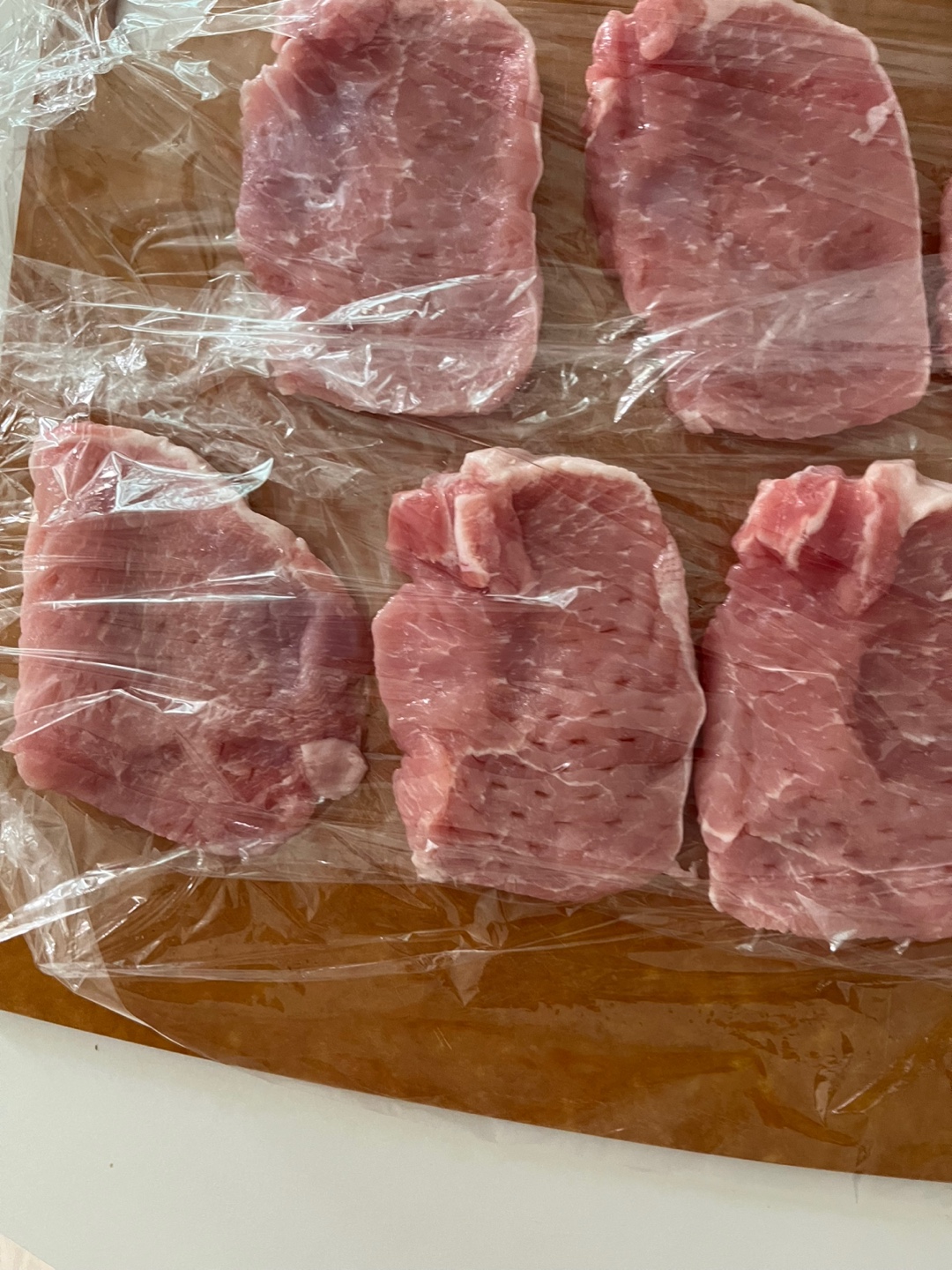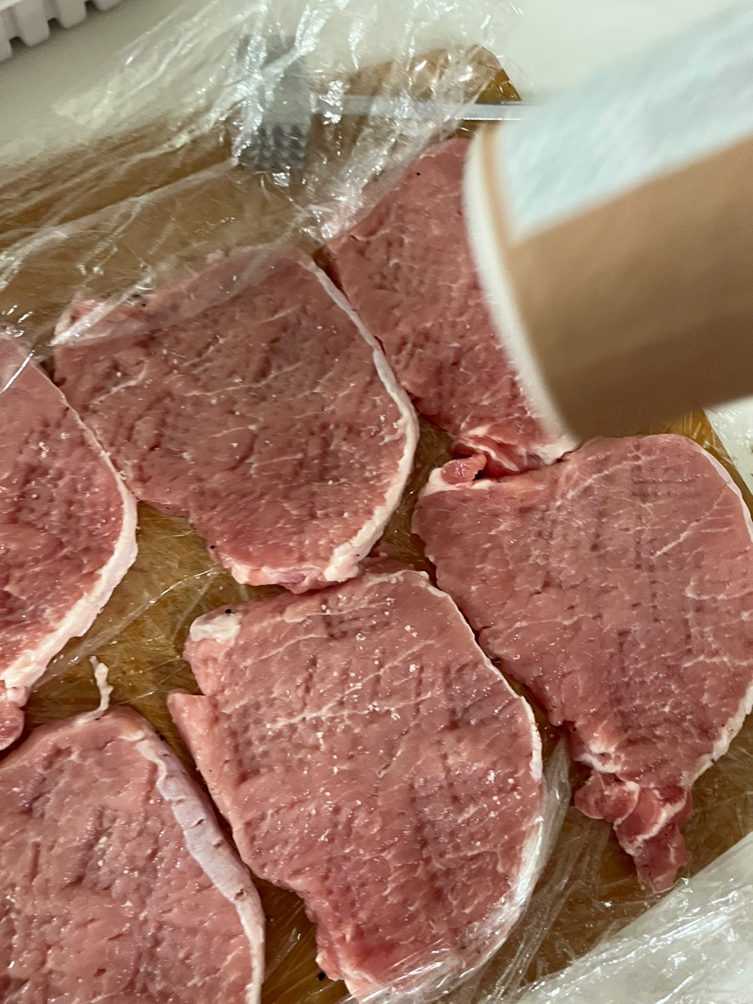 도마에 비닐을 깔고 고기 올리고 비닐을 깔아서 막 두드려줍니다