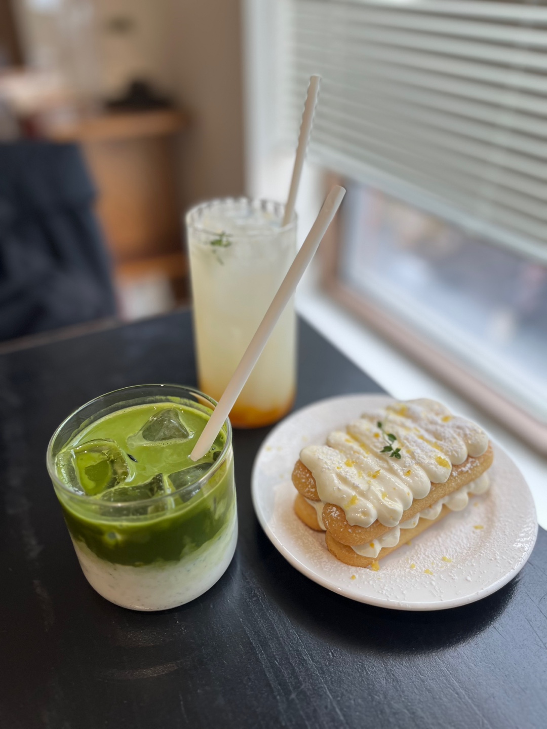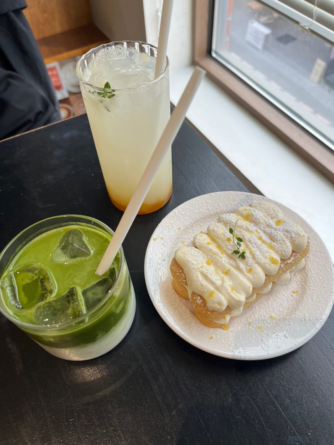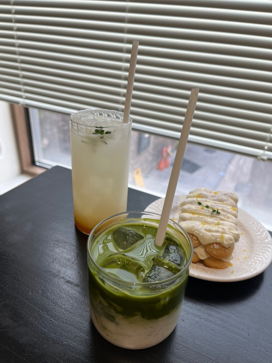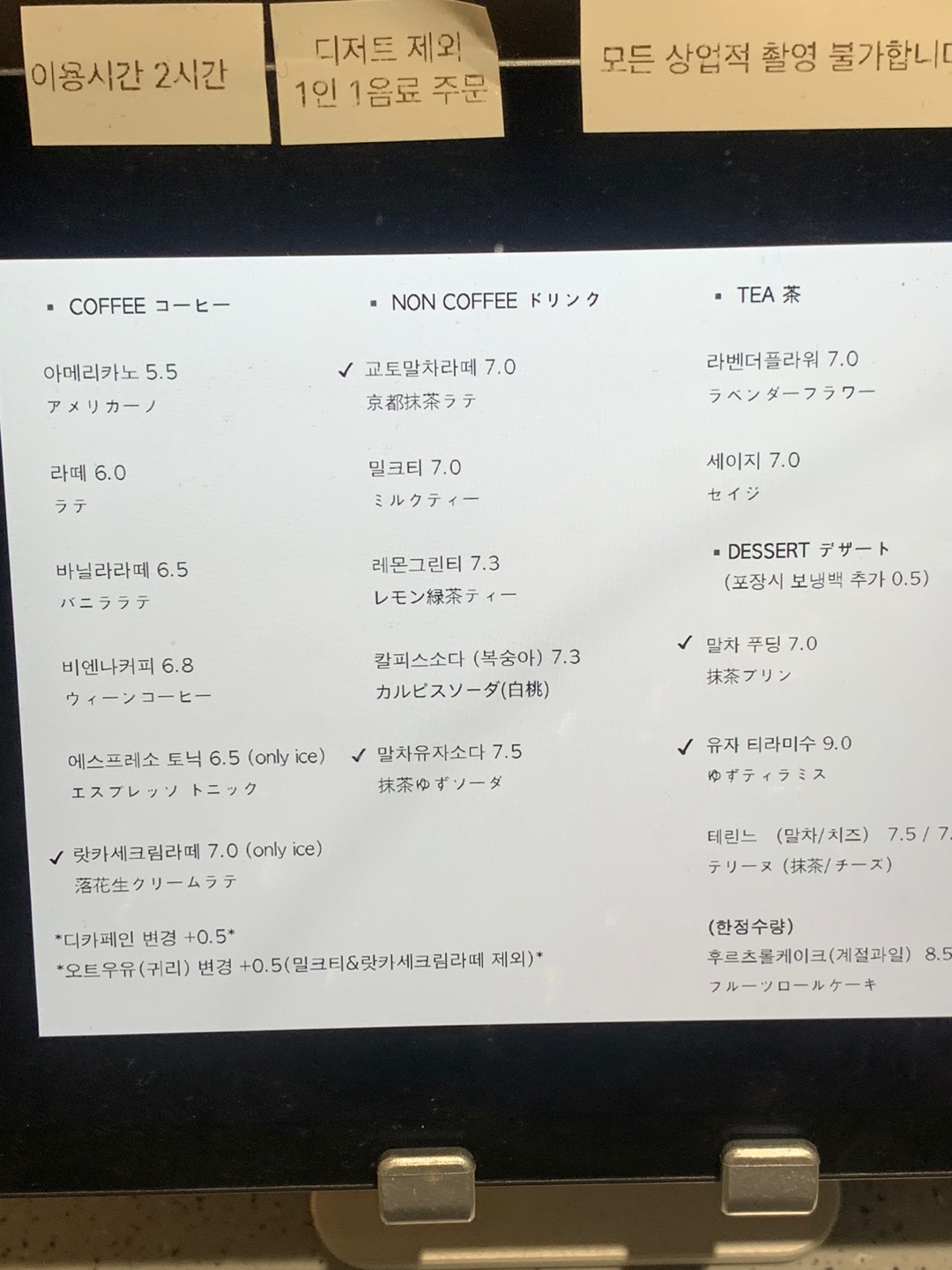 유자티라미수와 교토말차라떼 칼피스소다 주문했어요