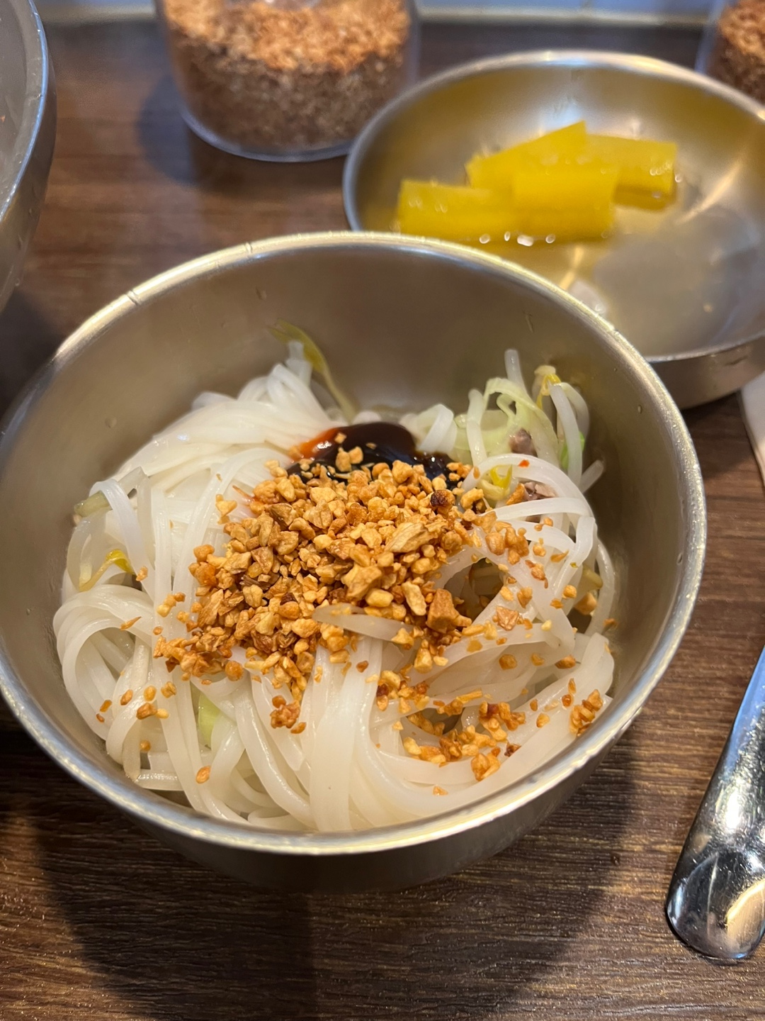 다른 쌀국수집과 다르게 요 마늘후레이크가 나오는 그릇에 쌀국수를 덜어서 소스와 버무려 먹기