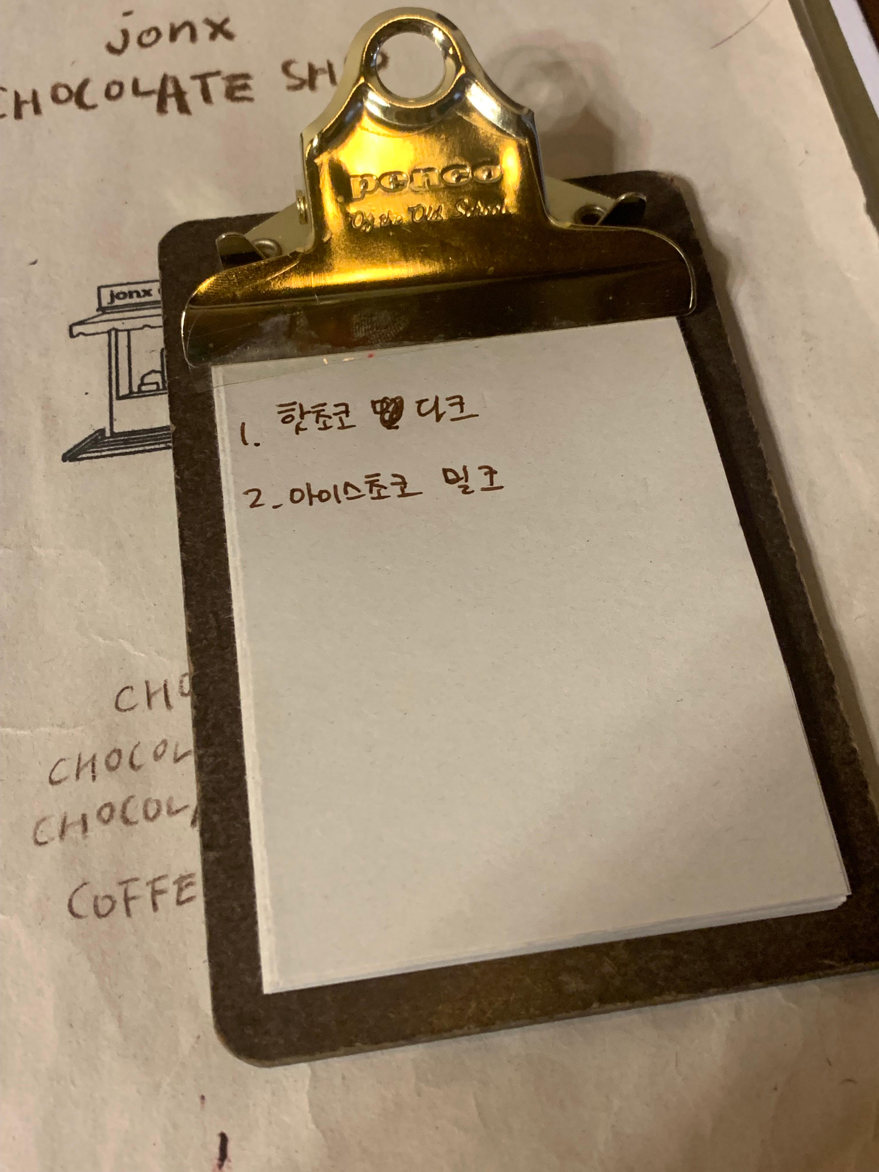 메뉴판보고 메뉴를 적어서 내는데 펜색깔도 전부 초콜렛색깔