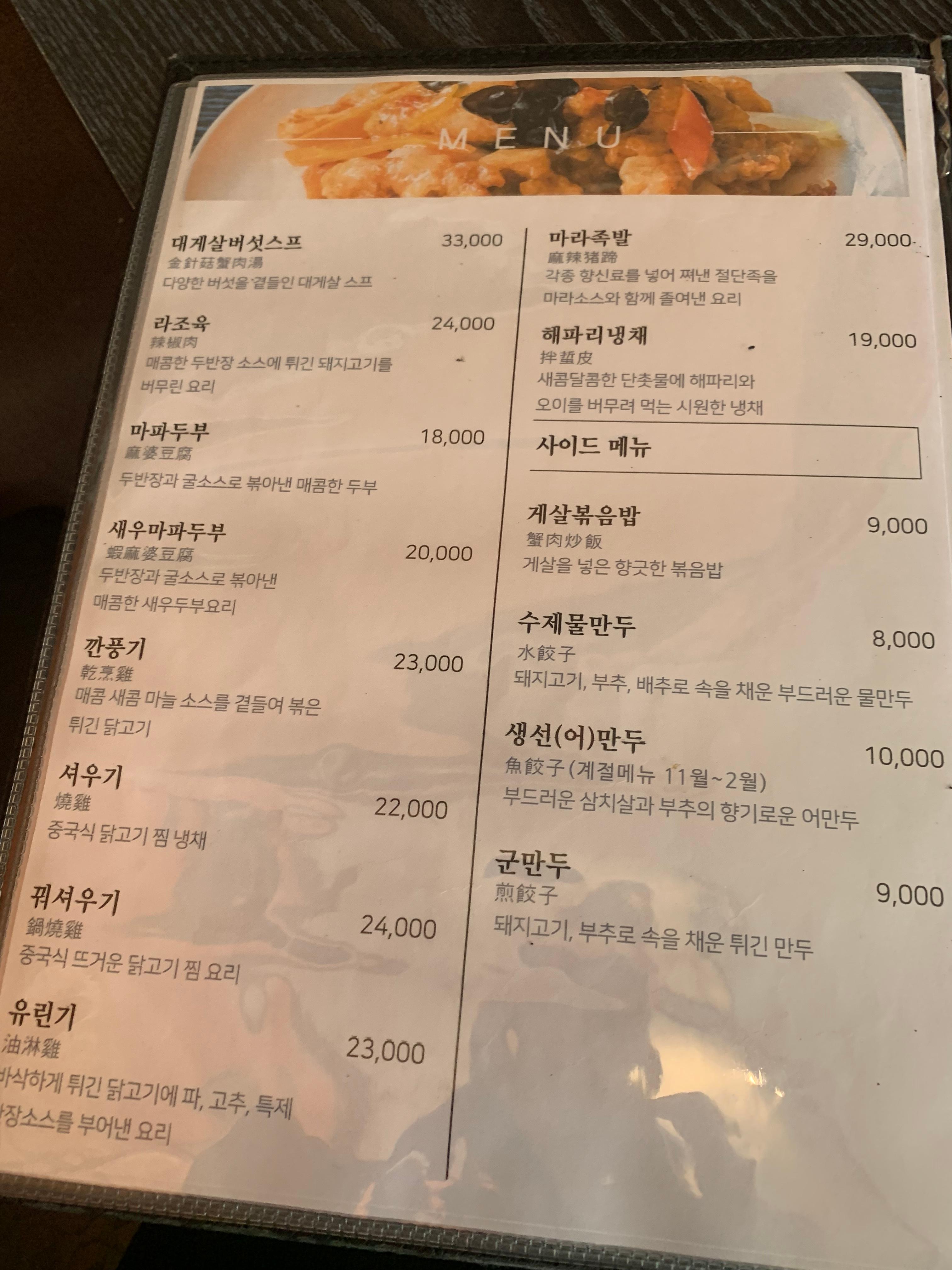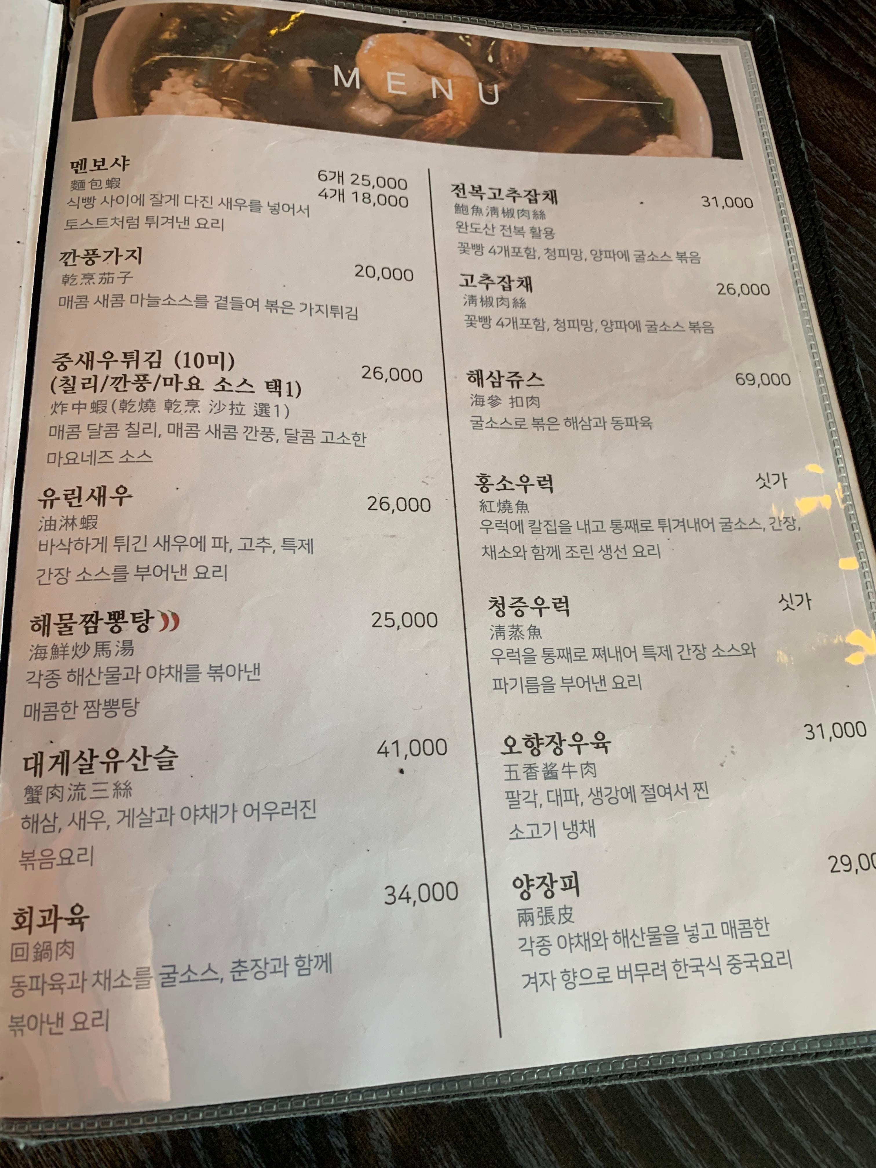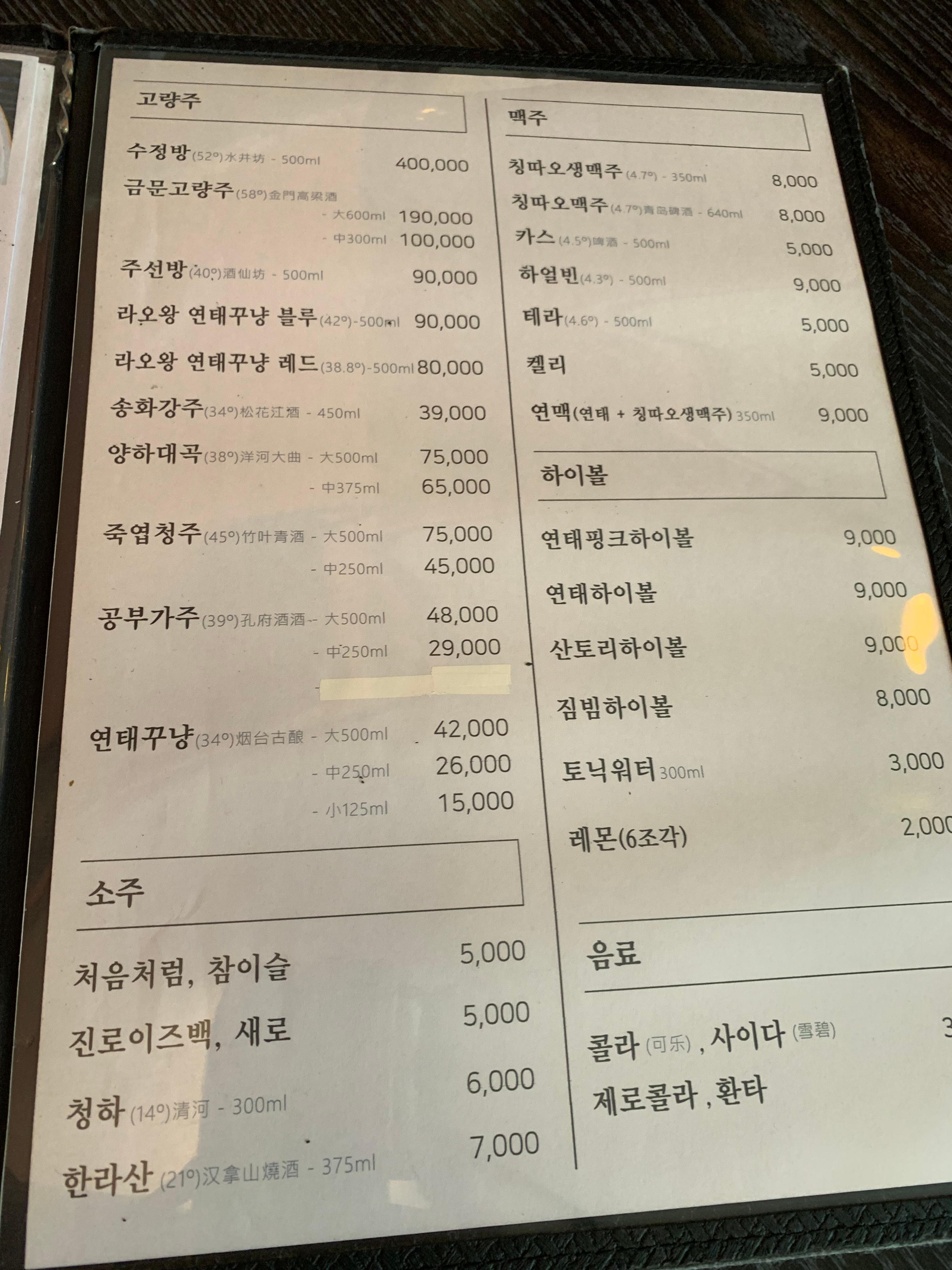 고량주 종류가 있고 요리주점이라 짬뽕탕, 유자탕수육, 군만두, 두반가지새우